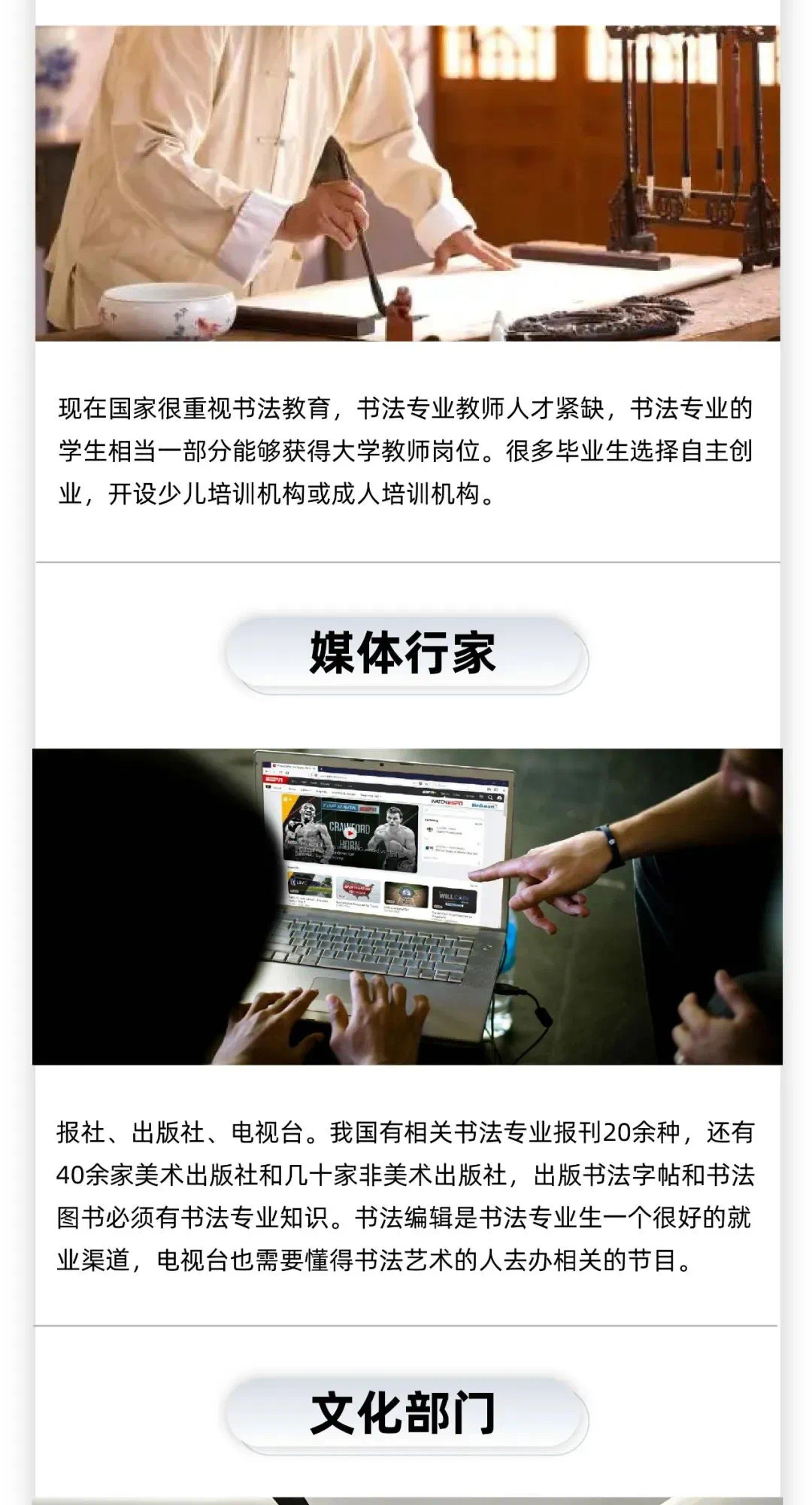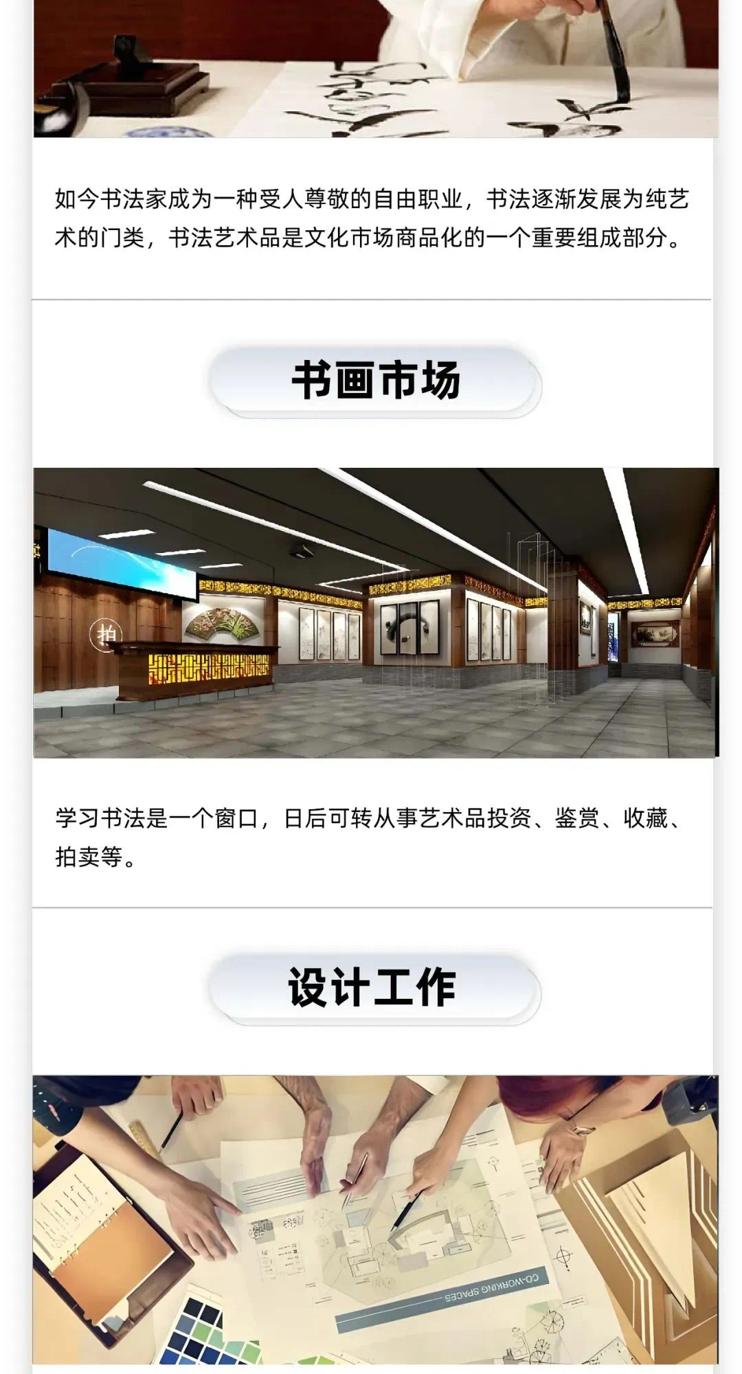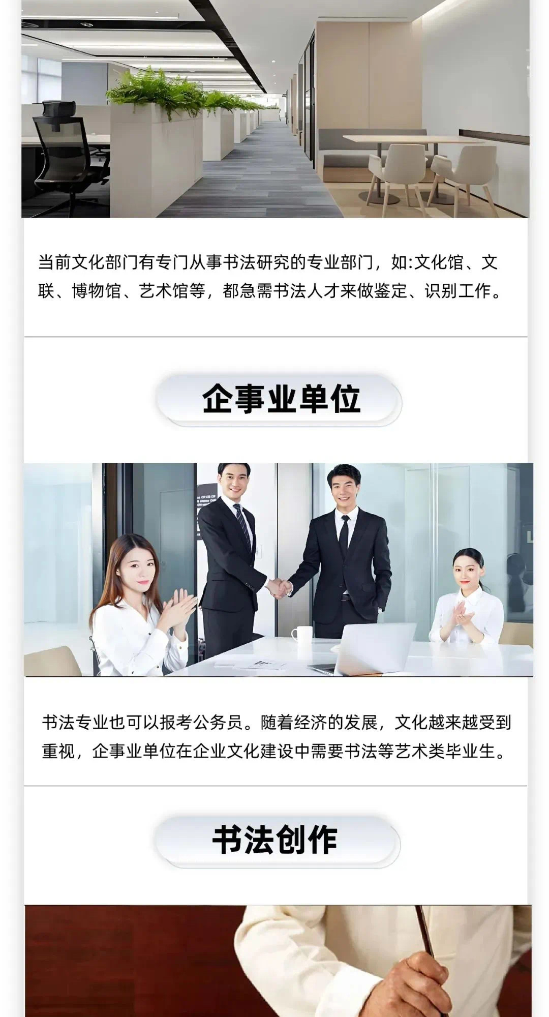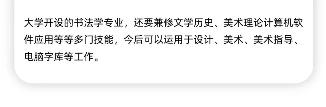 现在国家很重视书法教育,书法专业教师人才紧缺,书法专业的学生相当一部分能够获得大学教师岗位。很多毕业生选择自主创业,开设少儿培训机构或成人培训机构。