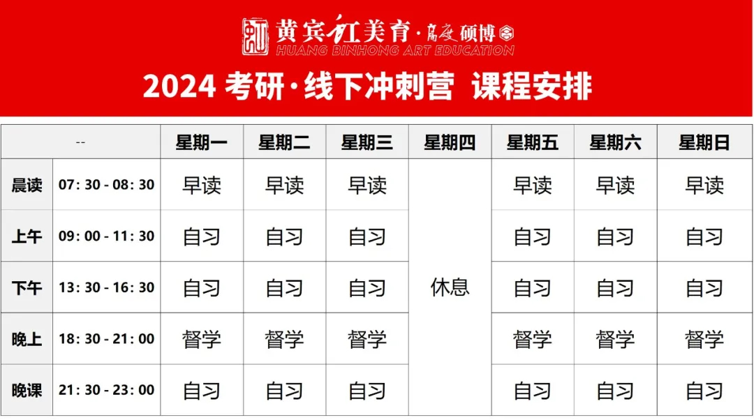 晨课、上午、下午、晚课,学员可根据自身情况复习史论、英语、政治。集训期间安排模拟测试及点评讲解,针对学员个人问题进行答疑,且指导下一步复习规划。